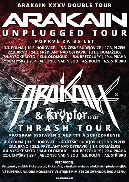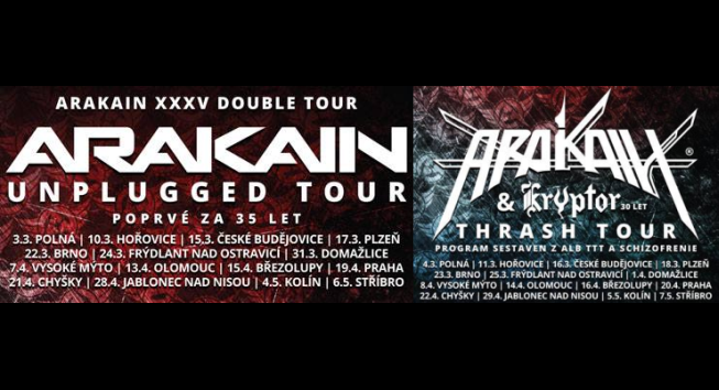 Česká metalová legenda Arakain oslaví v příštím roce pětatřicáté výročí existence kapely, a to opravdu ve velkém stylu: dvojitým turné. Arakain XXXV Double Tour 2017 zahrne vždy na každé zastávce dva koncerty ve dvou po sobě jdoucích dnech. První z nich bude unplugged, což je v dlouhé historii kapely rovněž poprvé. Druhý bude mít setlist složený z písní z dvou prvních alb Thrash The Trash a Schizofrenie, můžeme se tedy těšit na pořádnou nálož thrash metalu. Na druhý koncert si Arakain pozve své soukmenovce Kryptor, kteří zároveň oslaví třicet let na scéně.