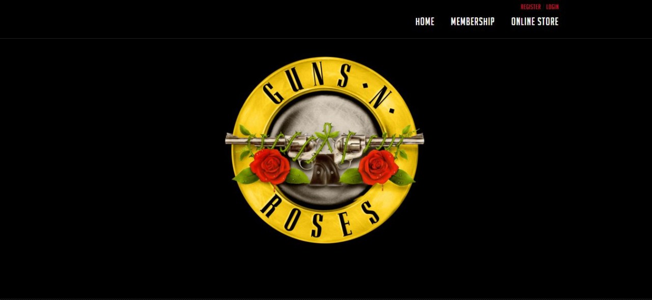 Úvodní stránka oficiálního webu Guns'N'Roses s typickým kulatým logem z 90. let