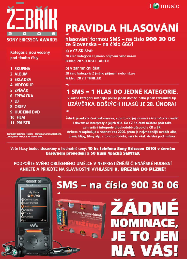 Podpořte svého oblíbeného umělce v nejprestižnější čtenářské hudební anketě a přijďte na slavnostní vyhlášení 9. března do Plzně! Vyhrajte mobilní telefon Sony Ericsson Z610l nebo megapacky nápoje Semtex!