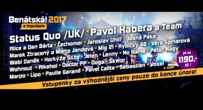 Festival Benátská! odtajnil další část svého line-upu. Tentokrát láká na unikátní spojení. Na pódiu se objeví např. Marek Ztracený s Martou Jandovou, Věra Špinarová vystoupí za doprovodu své kapely plus dechového tria. Návštěvníci uvidí i další raritní vystoupení - Jasnou páku s Davidem Kollerem či kapelu Alice s Danem Bártou. Festival také změnil oficiální název na Benátská! s Impulsem, neboť má nového mediálního partnera - Rádio Impuls. Mezi další jména, která vystoupí na jubilejním 25. ročníku festivalu, patří například Rybičky 48 (se speciální pyrotechnickou show), Čechomor, Mig 21, Jaroslav Uhlíř či Wabi Daněk.