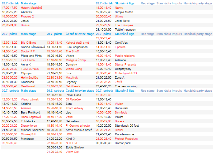 V pátek od odpoledních hodin zahrají např. Sabina Křováková, Doctor PP, Anna K, Ewa Farna, Mňága a Žďorp, Dymytry, Olympic, Horkýže Slíže, Krucipüsk, keltským punk rockem ozvláštní line-up Pipes and Pints a večer se můžeme těšit na vystoupení hvězdného Toma Jonese.