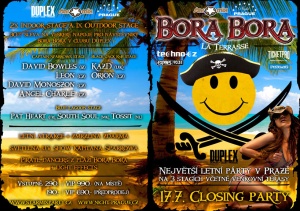 Díky nadšení a věrnosti naších párty příznivců, partnerů a podporovatelů všeho druhu a po velkém úspěchu první a druhé BORA BORA la terrasse, kterou navštívilo přes 4tis. lidí, Vás čeká poslední z letošní naplánované troj-edice ... BORA BORA - "Closing Party"!!! ... opět se bude odehrávat na třech stagích clubu Duplex!