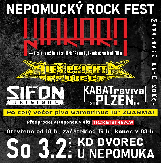 Jako dar z nebes v době, kdy koncertů bývá méně, se vyloupl Nepomucký Rock fest konaný 3. února v Kulturním domě Dvorec u Nepomuka. Plzeňsko je navíc oblastí, kde tvrdá muzika byla vždycky doma. Akci moderuje uznávaný hudební odborník, publicista Petr Korál.