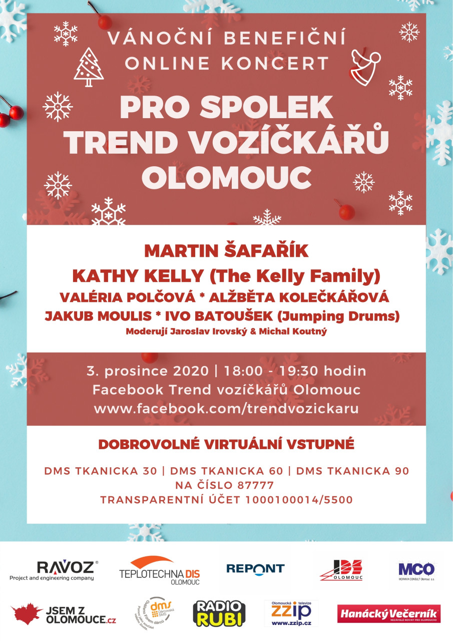 Spolek Trend vozíčkářů v Olomouci pořádá hned zkraje prosince druhý ročník Vánočního benefičního koncertu. Vzhledem k okolnostem proběhne tento koncert letos online místo na vánočních trzích, jak bylo původně plánováno. V programu vystoupí oblíbení umělci, z nichž několik prošlo talentovými soutěžemi, a těšit se můžeme i na vystoupení zahraničního hosta ze slavné zpívající rodiny.