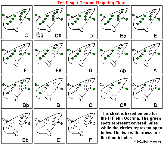 Rozpis hmatů pro okarínu desetidírkového typu. Zelené kroužky znamenají zakryté otvory, bílé odkryté. Otvory se šipkami jsou umístěny na spodní straně okaríny a zakrývají se palci.