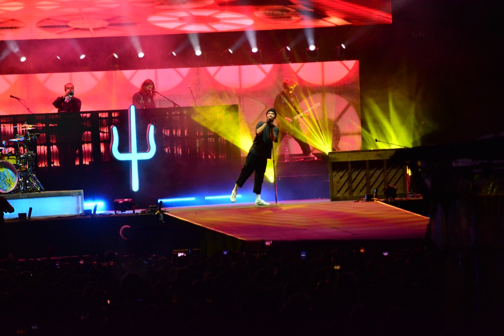 Všem bylo jasné, že tou největší hvězdou prvního dne budou bezesporu Twenty One Pilots. A ti opravdu odpálili nálož obrovského kalibru. Na pódiu přímo "vybuchla atomová bomba". Kapela vtrhla na hlavní stage v kuklách a davem diváků se začaly šířit spekulace a obavy, zda si vůbec zpěvák Tyler Joseph a bubeník Josh Dun během show kukly sundají alespoň na chvíli. Ale samozřejmě se s kuklou špatně vyplazuje jazyk, což bylo častým gestem právě Joshe. Na konci druhé písně šly kukly dolů a následovalo Joshovo salto, po kterém se vrátil opět bušit do svých bicích s provokativními gesty, během kterých šly fanynky do kolen. Šlo mu to opravdu skvěle a oproti jiným bubeníkům si stihl sem tam od bicích odskočit a rozvášnit dav. Bylo ho zkrátka na pódiu plno. Když bylo zcela jasné, že nepůjde o žádnou poklidnou show, ale o pořádný rachot, sedli všichni na stupínek pódia, zapálili ohníček a při táboráku zazpívali akustický set, během kterého zazněl třeba cover I Can See Clearly nebo česká Co jste hasiči, zahraná na trubku. "Piloti" zkrátka předvedli strhující vystoupení a všem bylo jasné, že nastavili laťku hodně vysoko a jen tak ji nikdo nepřeskočí. A skutečně do konce festivalu ani nepřeskočil. Jedinou drobnou slabinou zvuku bylo časté přebasování.
