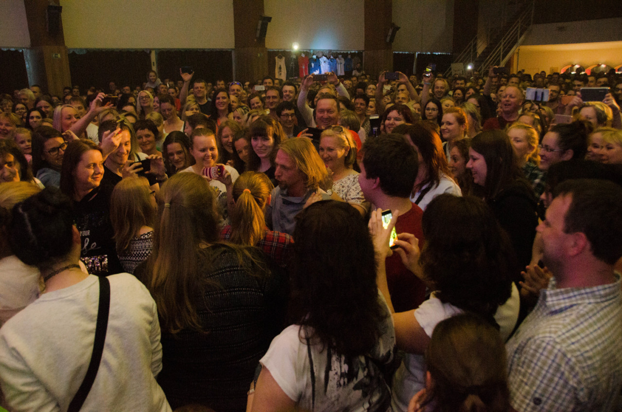 Úžasné ale bylo, jaký měl Klus přístup k lidem a otevřený vztah s publikem. Nejen že do něj nesčetněkrát slezl z podia, s lidmi mluvil (resp. zpíval), zajímal se a vůbec byl velmi přátelský. Přál nějakým slečnám k narozeninám a Natálii ke svátku, k mezinárodnímu dni autistů, k dívce, co si stěžovala že špatně vidí, přišel a ještě vymyslel improvizační píseň na téma "dívka s perspektivou", zpíval s vozíčkáři. Také vyskočil na bar a když se ptal, zda-li někdo nemá nějaké přípomínky, či mu nechce něco říct, ozvala se z publika dívka Pavča, že by si s nimi ráda zahrála. Lokomotivu od kapely Poletíme. Kluky to evidentně trochu zaskočilo, že si celkem spletla koncert, ale Pavča nakonec skutečně na podium šla a Poletíme na kytaru zahrála, odzpívala a dokonce se k ní přidala i kapela. A sklidila obrovské ovace od publika. Neskutečné. Věřím, že i ti, co nejsou tak unešení z Tomášovy hudby, museli být nadšeni z jeho přístupu, jelikož opravdu všechny "vtáhl do děje". Výborné. Snad jen kvůli tomu neskutenčně osobitému a lidskému přístupu, humoru, veselé náladě a energii, kterou hoši předávali, se na koncert vyplatí jít, protože to se opravdu jen tak nevidí.