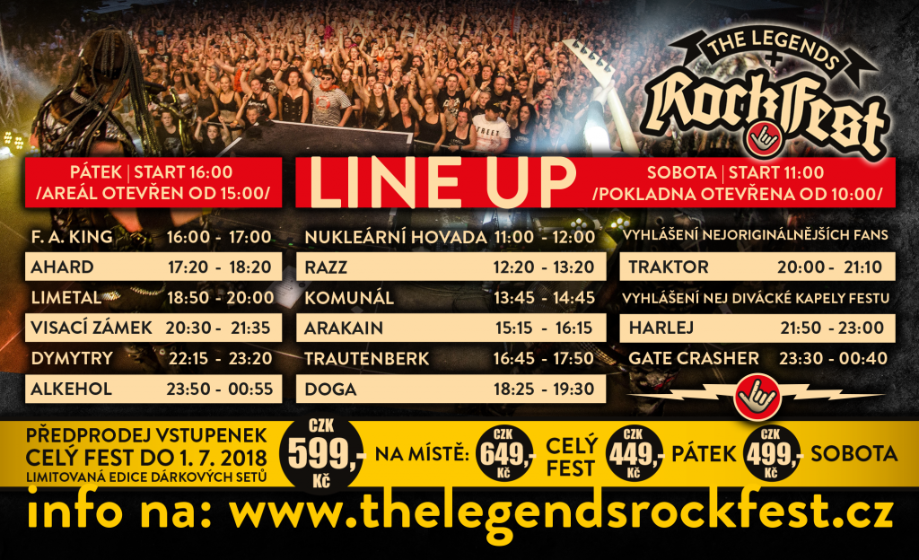 Letošní The Legends Rockfest již zná svůj časový rozpis a zve i na doprovodné akce. Festivalová dramaturgie vsadila na nejvýraznější jména české tvrdé muziky jako Arakain a Visací zámek, energickou show předvedou Limetal či Dymytry. I letos přijedou někteří pravidelní účinkující – Doga, Harlej, Alkehol, Komunál, Traktor, nově se představí Trautenberk.