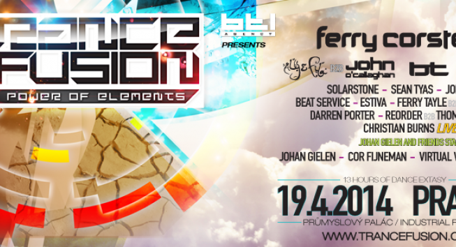 Průmyslový Palác v Praze již brzy znovu oživne pod rytmy trancové hudby v rámci akce Trancefusion Power of Elements. Tato živly nabitá party vypukne 19. 4. 2014 a její 13. hodinový program bude servírovat čistý trance svým fanouškům z celého světa. Tento rok se mohou těšit na exkluzivní sety světových DJ, kteří byli poskládáni do silného line-up tak, aby uspokojili i ty nejnáročnější posluchače této hudby. Ti se mohou nechat uchvátit na hlavní stage zejména vystoupeními od Ferry Corsten, Aly & Fila b2b John O’Callaghan, BT, Solarstone, Andrew Rayel, Sean Tyas, John Askew, Beat Service, Ferry Tayle b2b Manuel le Saux, Darren Porter a ReOrder b2b Thomas Coastline. Mezi speciálními hosty vystoupí Christian Burns, který doplní tyto DJ svým zpěvem.